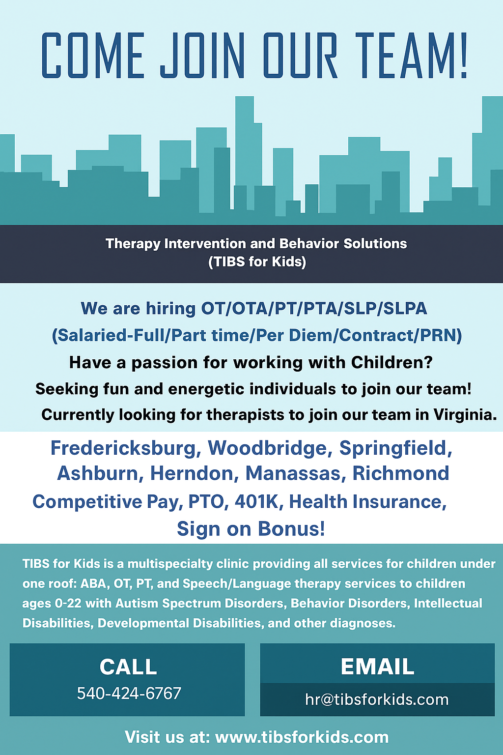 As an OTA at TIBS for Kids, you will work under the supervision of a licensed occupational therapist to help people with physical, mental, or emotional challenges improve their ability to perform daily living and work-related tasks. At TIBS for Kids, OTA’s are responsible for:
